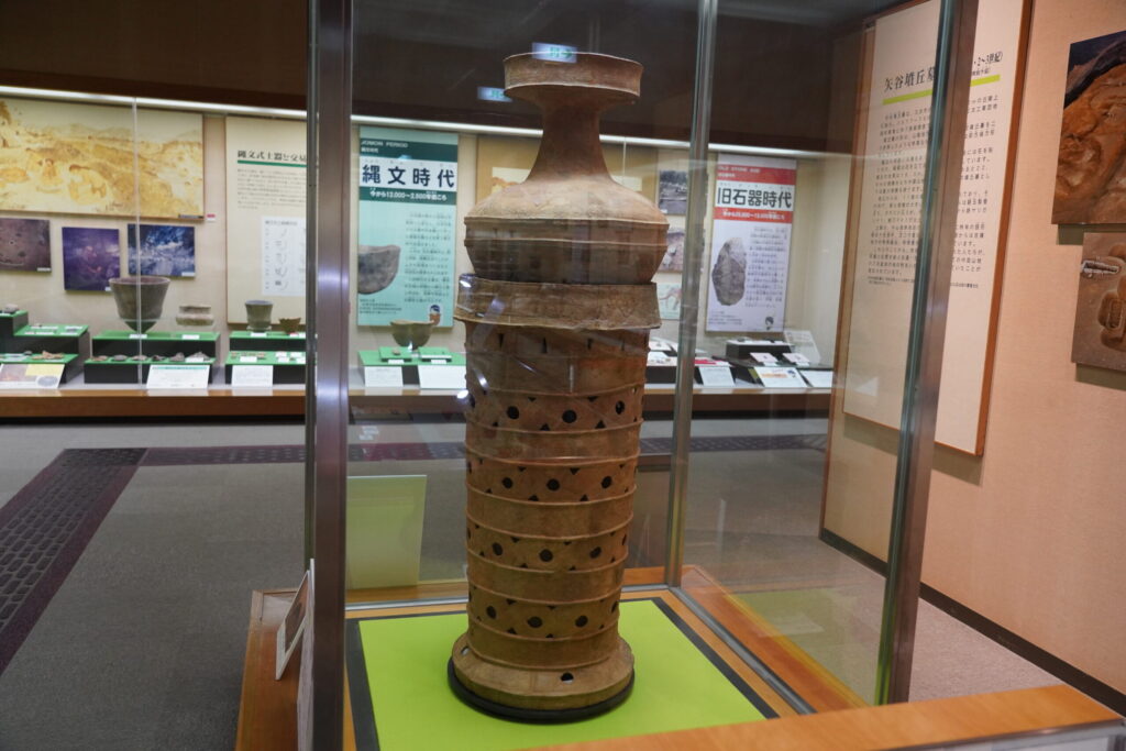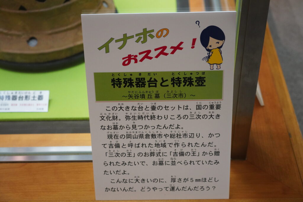 この資料館に、三次市の矢谷墳丘墓(やだにふんきゅうぼ)〔広島県三次市東酒屋町〕から出土した特殊器台・特殊壺が展示されています〔写真3〕。